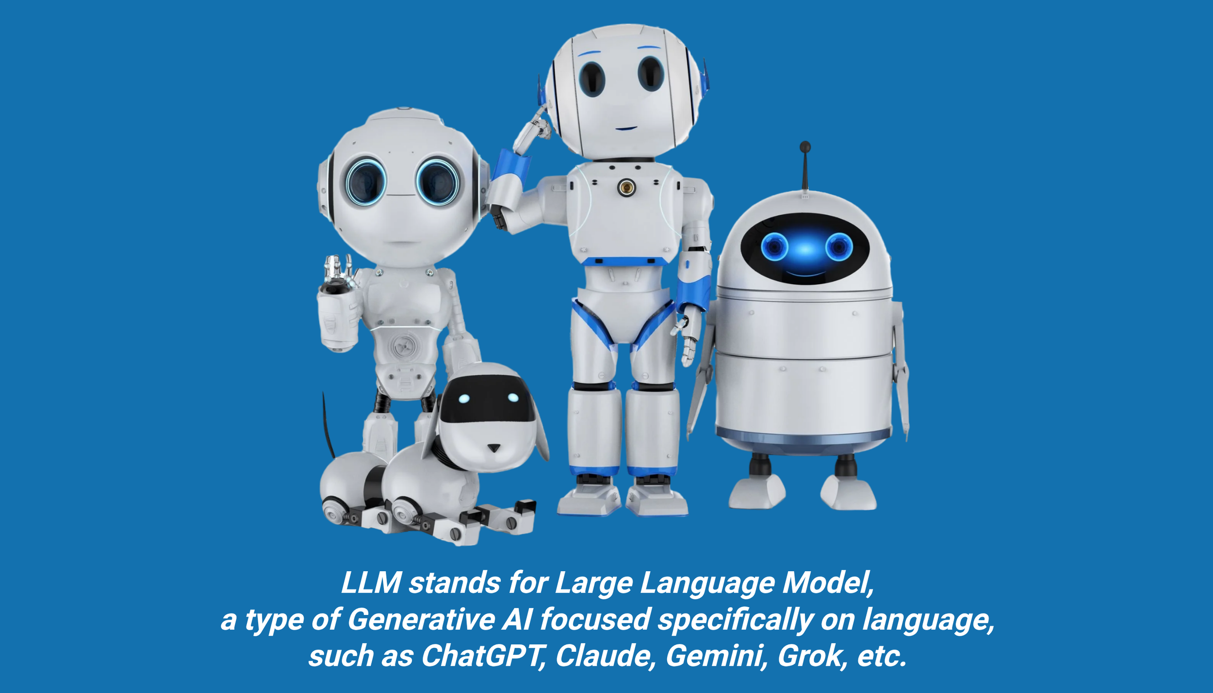 (LLM stands for Large Language Model, a type of Generative AI focused specifically on language, such as GPT-4, Claude, Gemini, Grok, etc.).
